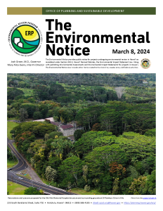 The Environmental NoticeThe Environmental Notice is published on the 8th and 23rd of each month and includes actions undergoing environmental review in Hawaiʻi, along with habitat conservation plans, safe harbor agreements, coastal zone and shoreline notices, some federal EAs and EISs under the National Environmental Policy Act (NEPA), and more. Current and previous issues are online. |